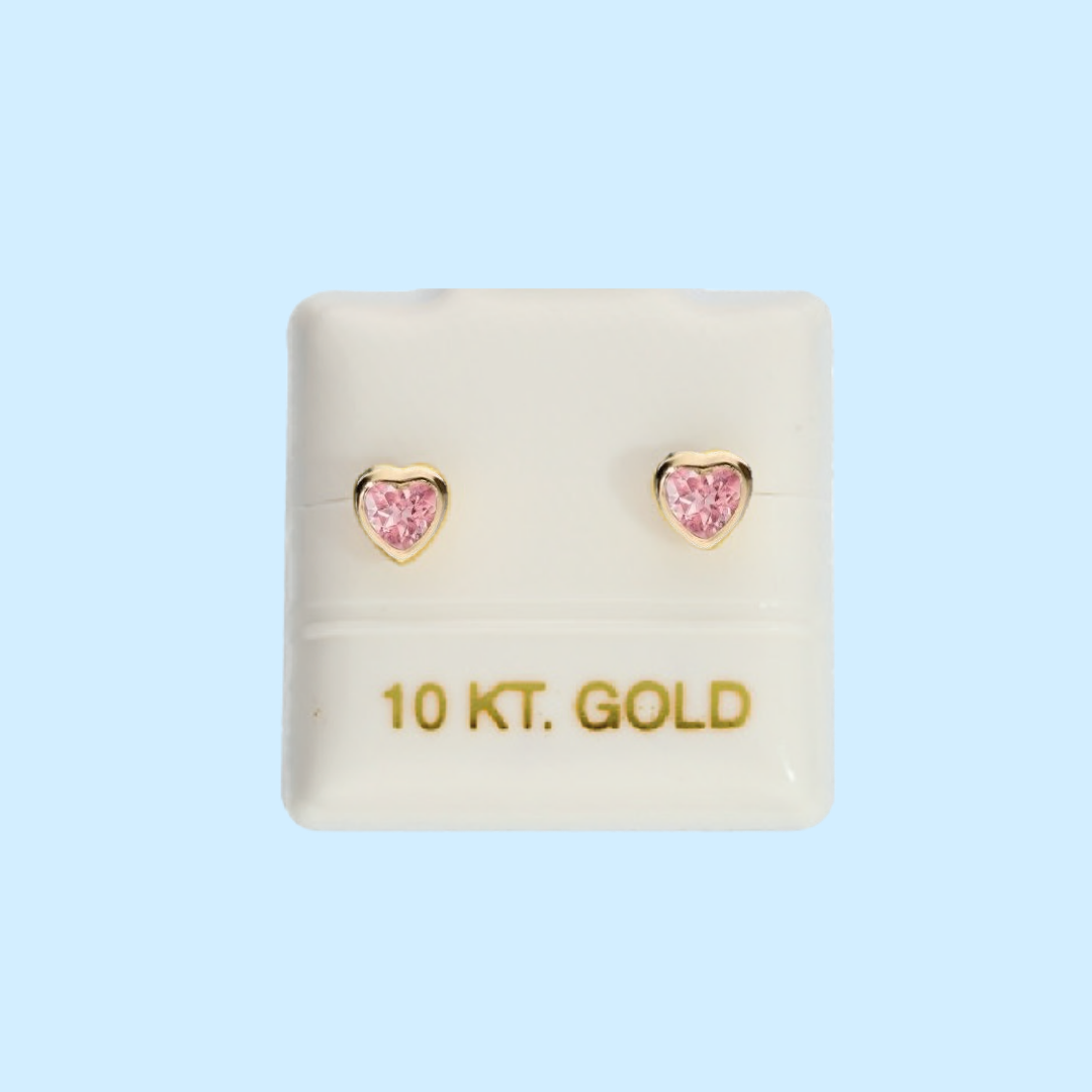 Encantadores aretes en forma de corazón, elaborados en oro de 10 quilates, con una brillante piedra de zirconia rosa que aporta un toque de dulzura y elegancia, perfectos para las pequeñas princesas.